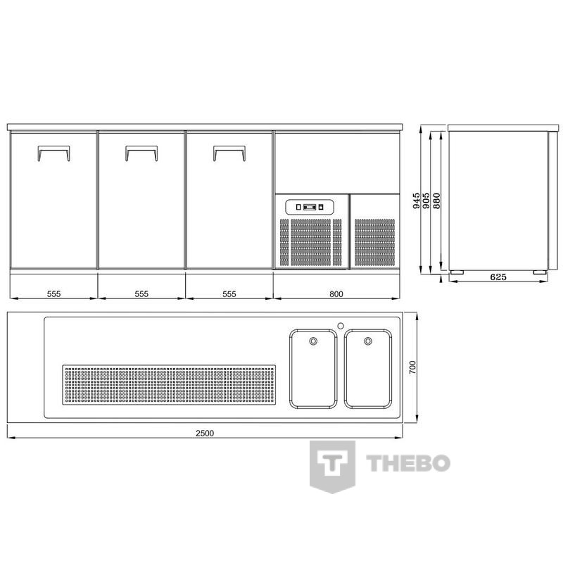 BxDxH 2500x700x950 mm Breedte uitwendig 2500 mm Diepte uitwendig 700 mm Hoogte uitwendig 950 mm Interieurbreedte 1545 mm Interieurdiepte 565 mm Interieurhoogte 795 mm Isolatiedikte 60 mm Specifieke eigenschappen