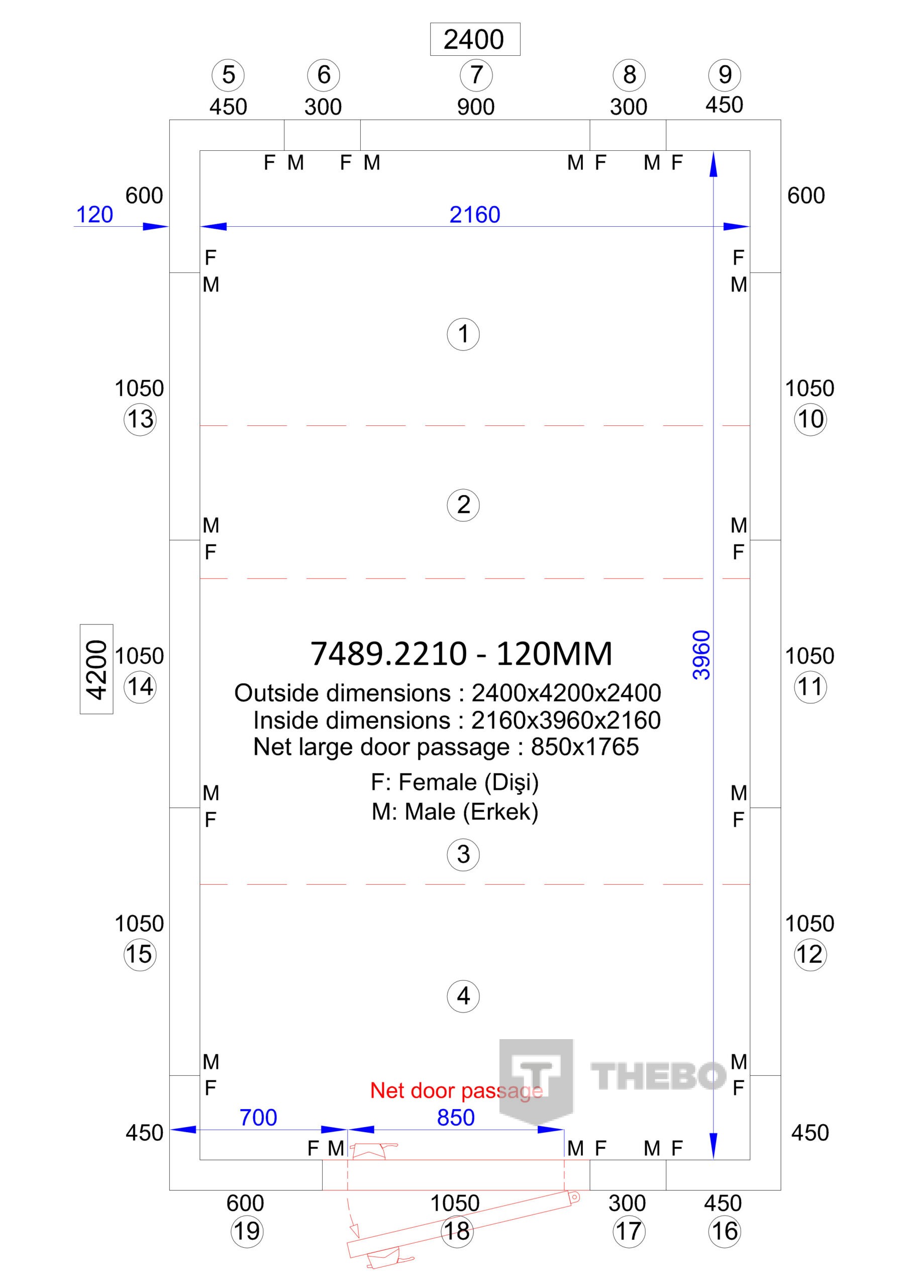 BxDxH 2400x4200x2400 mm Breedte uitwendig 2400 mm Diepte uitwendig 4200 mm Hoogte uitwendig 2400 mm Interieurbreedte 2160 mm Interieurdiepte 3960 mm Interieurhoogte 2160 mm Deurbreedte 850 mm Isolatiedikte 120 mm Specifieke eigenschappen