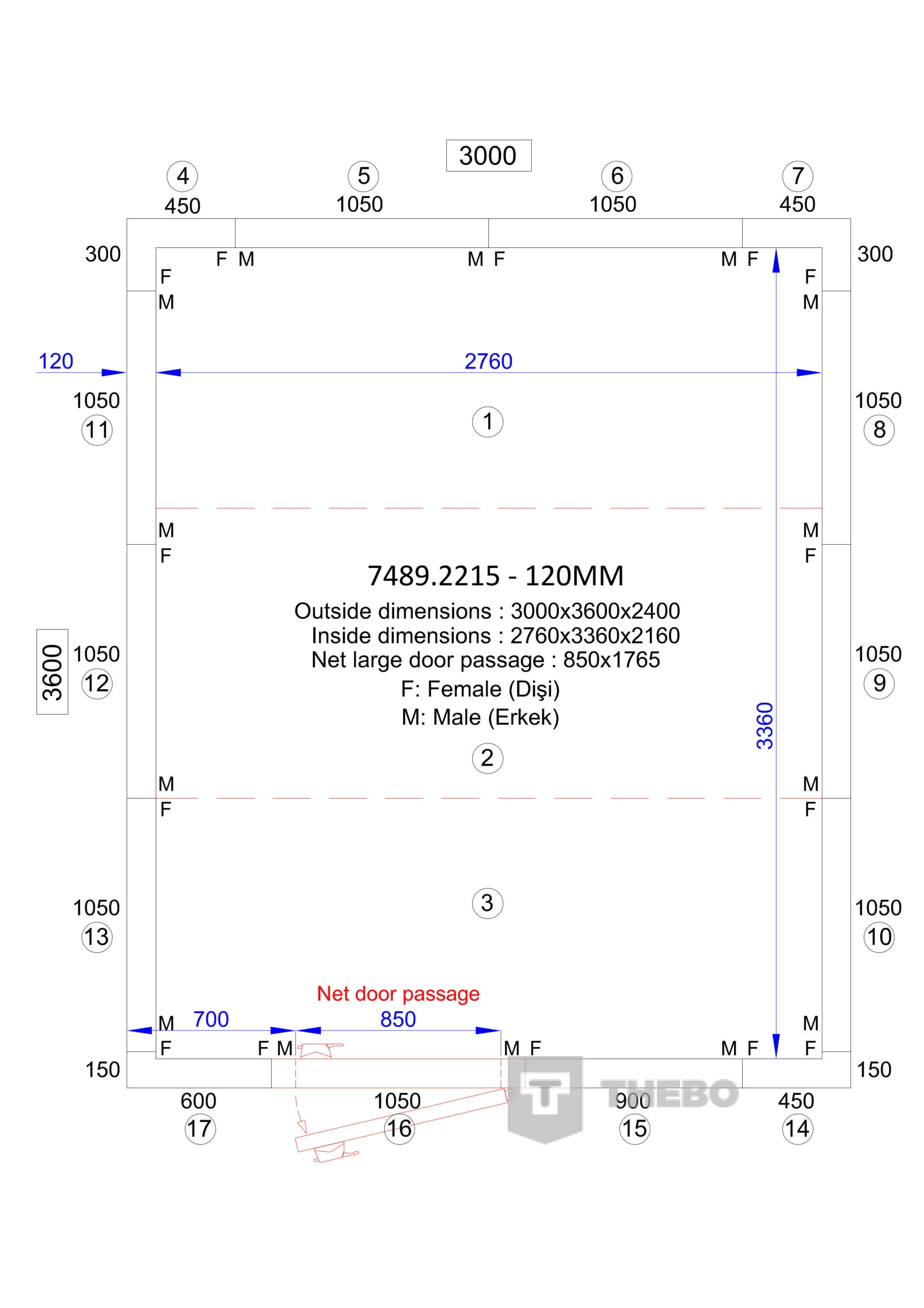 BxDxH 3000x3600x2400 mm Breedte uitwendig 3000 mm Diepte uitwendig 3600 mm Hoogte uitwendig 2400 mm Interieurbreedte 2760 mm Interieurdiepte 3360 mm Interieurhoogte 2160 mm Deurbreedte 850 mm Deurhoogte 1765 mm Isolatiedikte 120 mm Specifieke eigenschappen