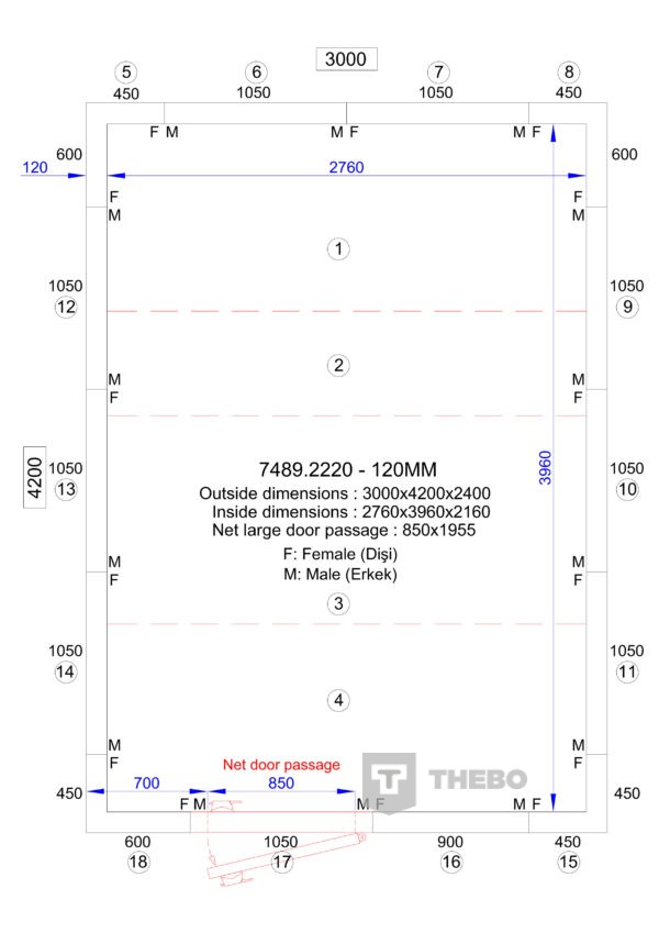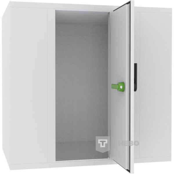 BxDxH 3000x4200x2400 mm Breedte uitwendig 3000 mm Diepte uitwendig 4200 mm Hoogte uitwendig 2400 mm Interieurbreedte 2760 mm Interieurdiepte 3960 mm Interieurhoogte 2160 mm Deurbreedte 700 mm Isolatiedikte 120 mm Specifieke eigenschappen
