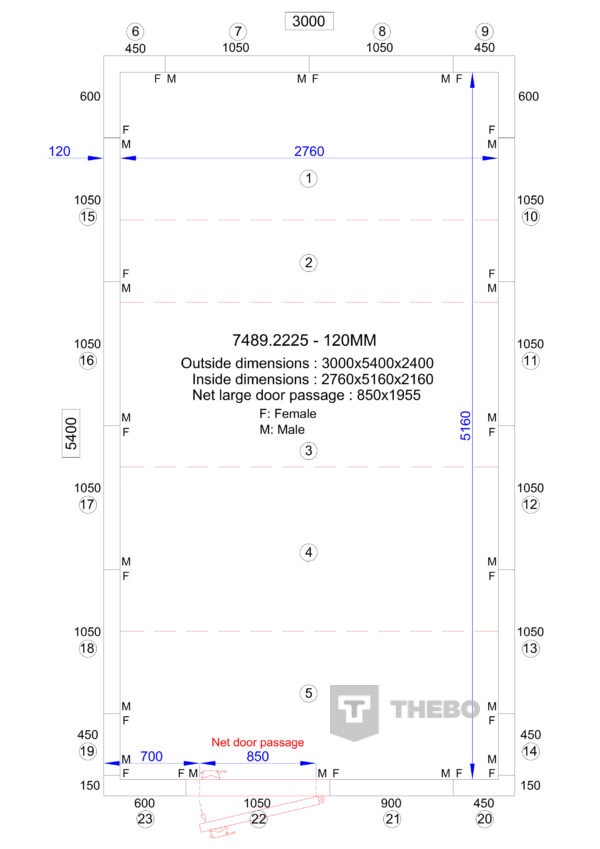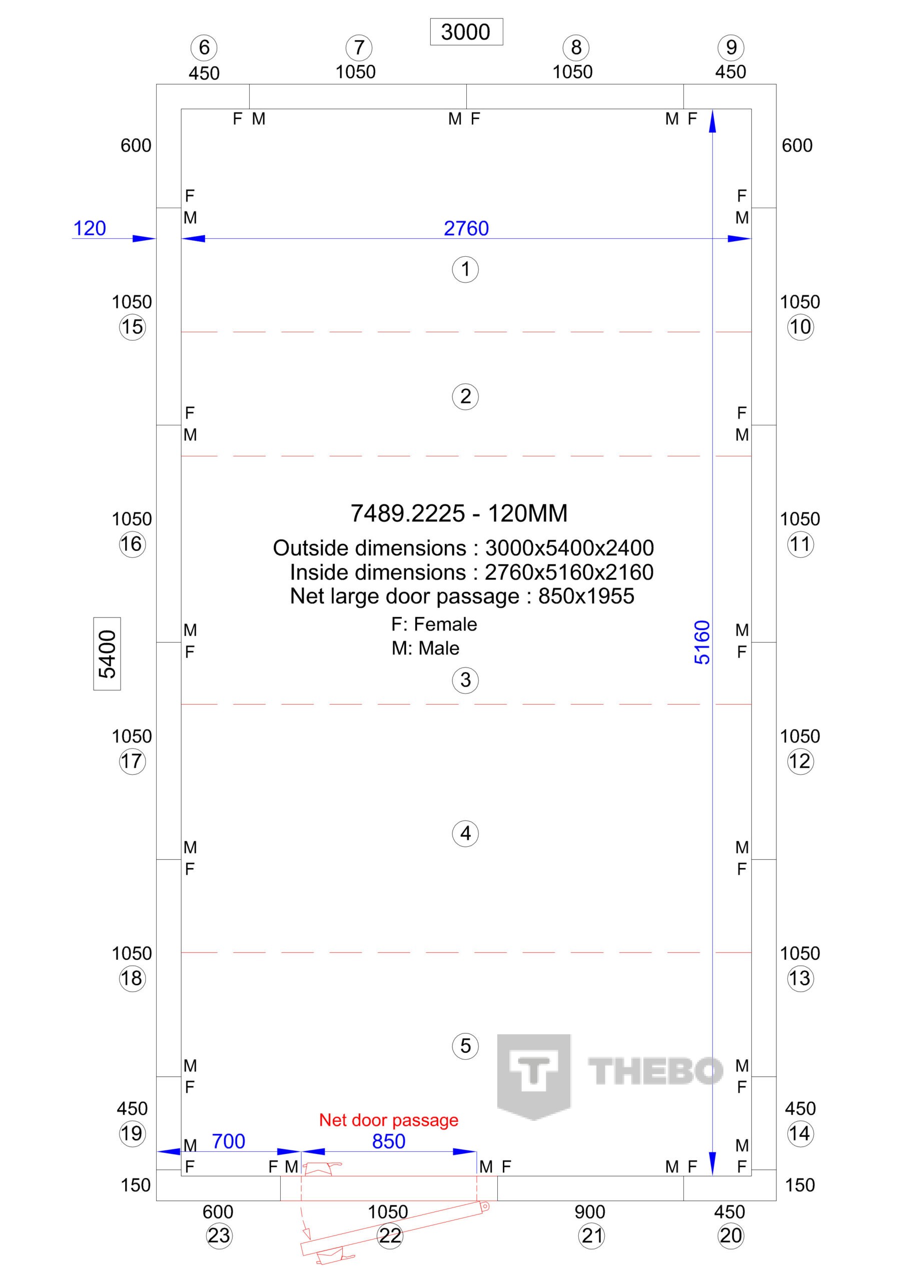 BxDxH 3000x5400x2400 mm Breedte uitwendig 3000 mm Diepte uitwendig 5400 mm Hoogte uitwendig 2400 mm Interieurbreedte 2760 mm Interieurdiepte 5160 mm Interieurhoogte 2160 mm Deurbreedte 700 mm Isolatiedikte 120 mm Specifieke eigenschappen