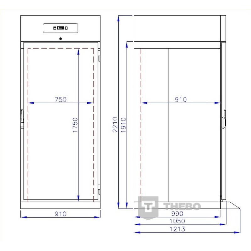 BxDxH 910x1210x2210 mm Breedte uitwendig 910 mm Diepte uitwendig 1210 mm Hoogte uitwendig 2210 mm Interieurbreedte 750 mm Interieurdiepte 910 mm Interieurhoogte 1750 mm Isolatiedikte 80 mm Maatsysteem 2/1 Gastronorm Specifieke eigenschappen